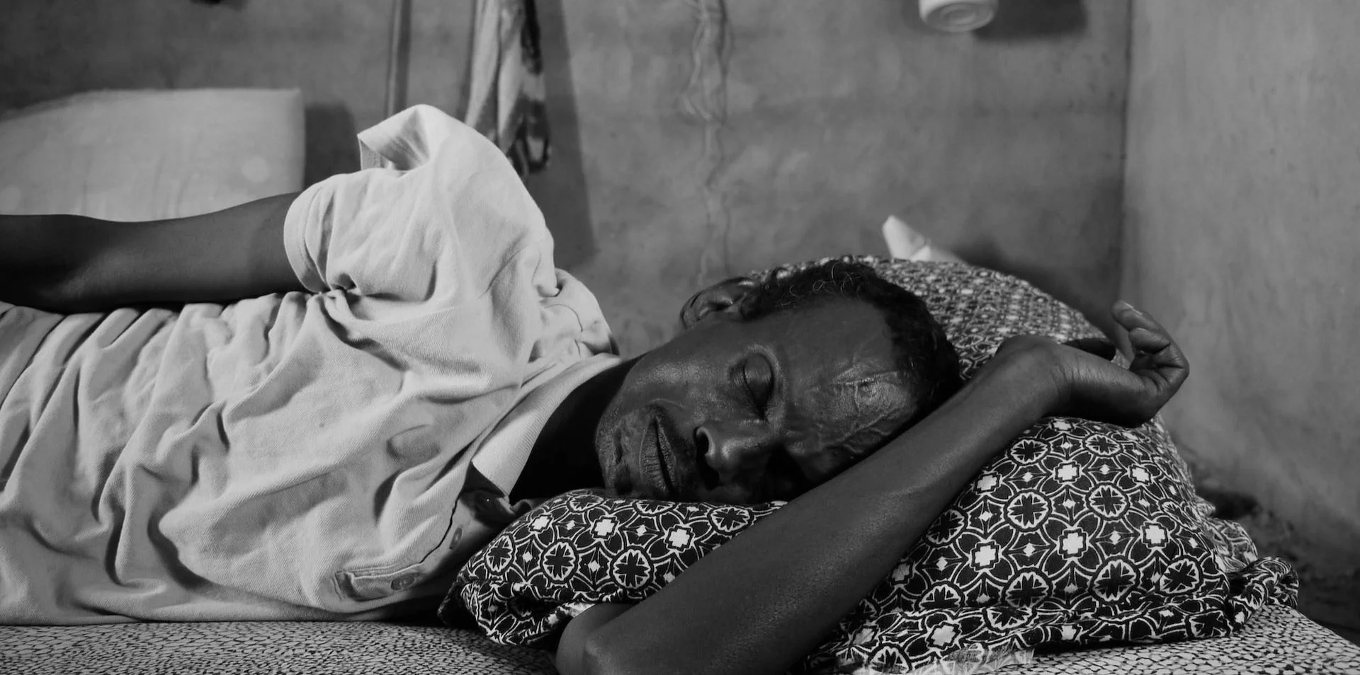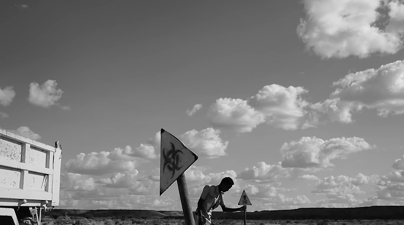 Harawe’s black-and-white short tells the story of a son taking care of his dying father. The film begins indoors, with the men facing opposite directions. Despite being physically close, their body language communicates an emotional distance between the characters. The father carefully swallows a white pill and his son informs him it’s the last one. He mentions visiting the city tomorrow to buy more medicine for his father. There is a feeling of time running out, of death approaching, but no real sense of urgency. It seems nothing can be done about the situation and this helplessness is palpable. The film’s slow pace mimics the slow violence. Harawe heightens this through the use of long takes, where we are forced to sit with the characters in the uncomfortable silences. There is also a sense of stillness, as if time is suspended. This stillness also appears in the humdrum of his daily routine. In Life on the Horn, we see a moment when the son driving around the village stops to straighten the toxic warning signs.